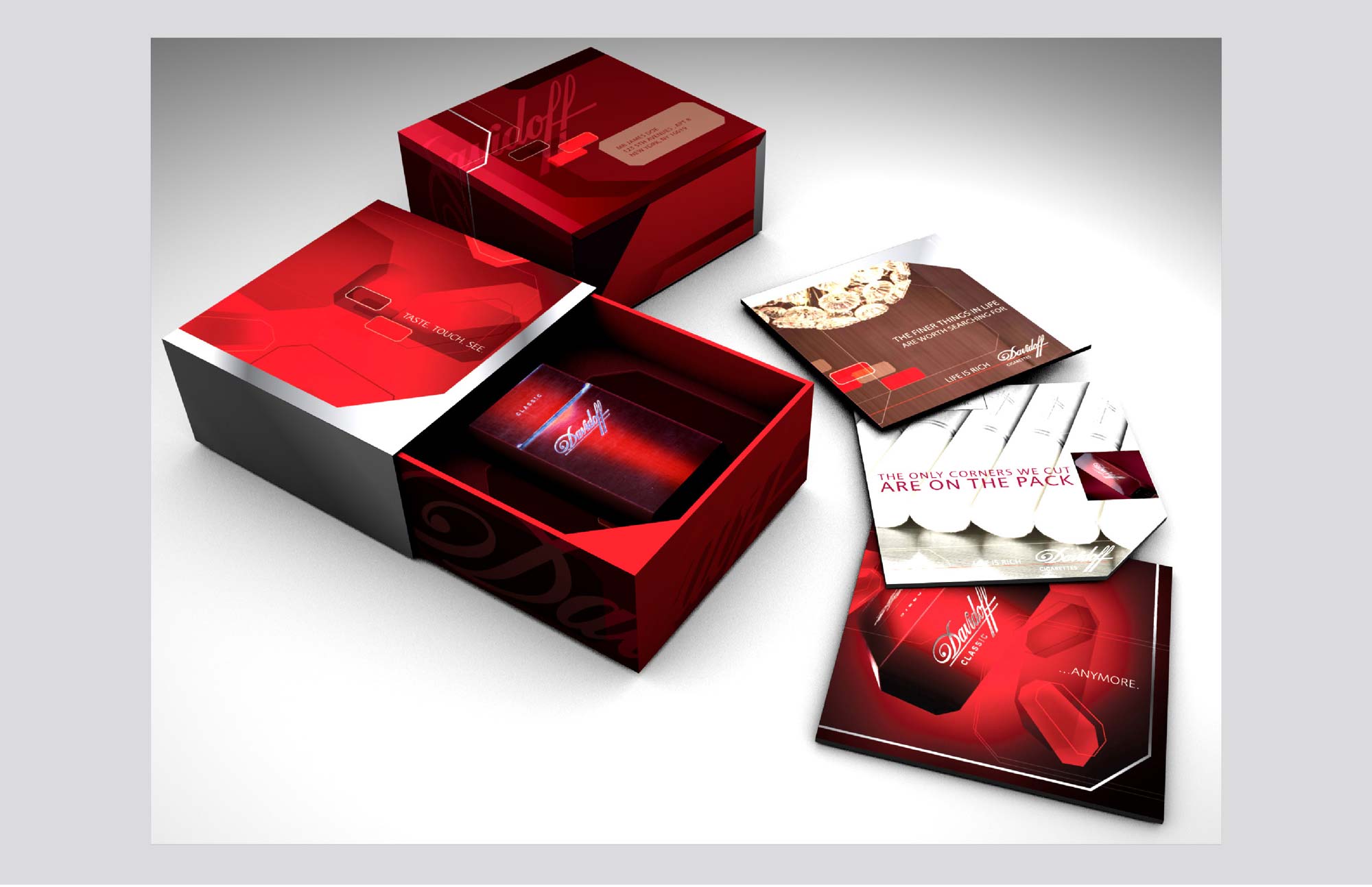 Brand introduction into the us market. the look is one of sophistication and impeccable quality to match the product. Individualized letters and one of a kind lighter with coupons further enhance the product image. The study box with a slide out container are made from the finest materials, just like the product.