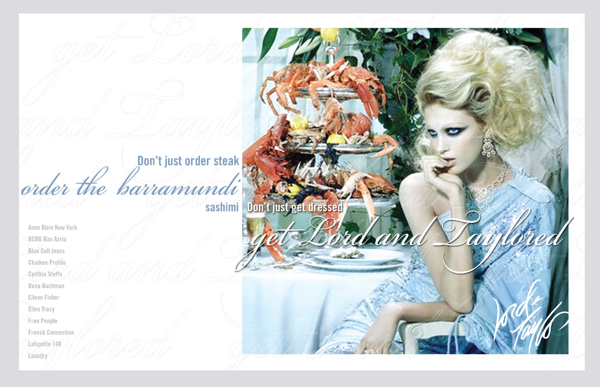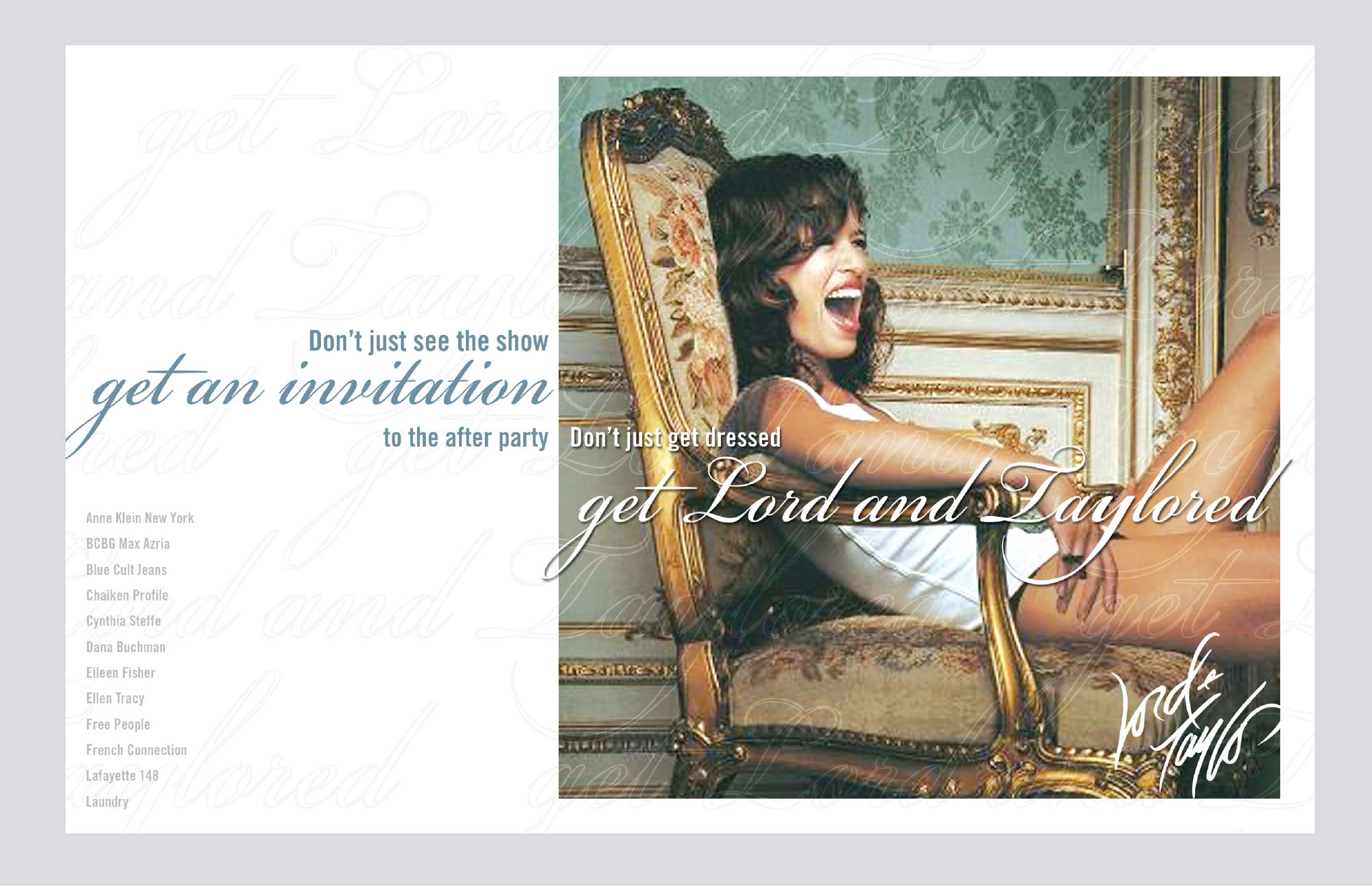 Educate consumers on the benefits of shopping at lord and taylor. Secondly, bring attention to the many brands offered under one roof. Elevating the shopping experience by offering the consumer's 'a bit more', like the customized alterations and more designer names under one roof. The visual reflects the extra bit you get and should aspire for in all walks of life, featuring top brands and an attitude befitting the brand. the decadence and the aspect of luxury are played up in the visual execution.