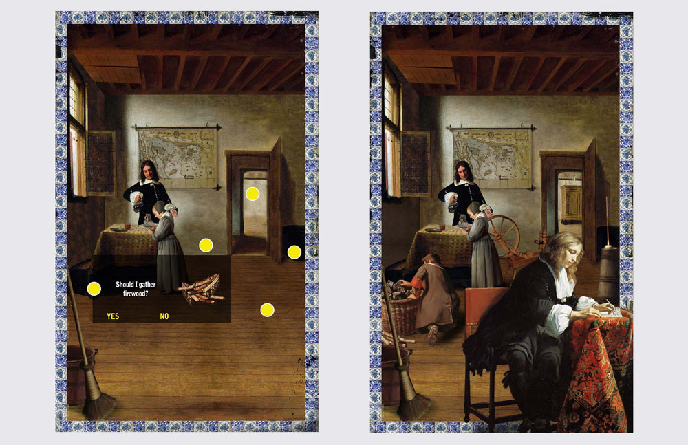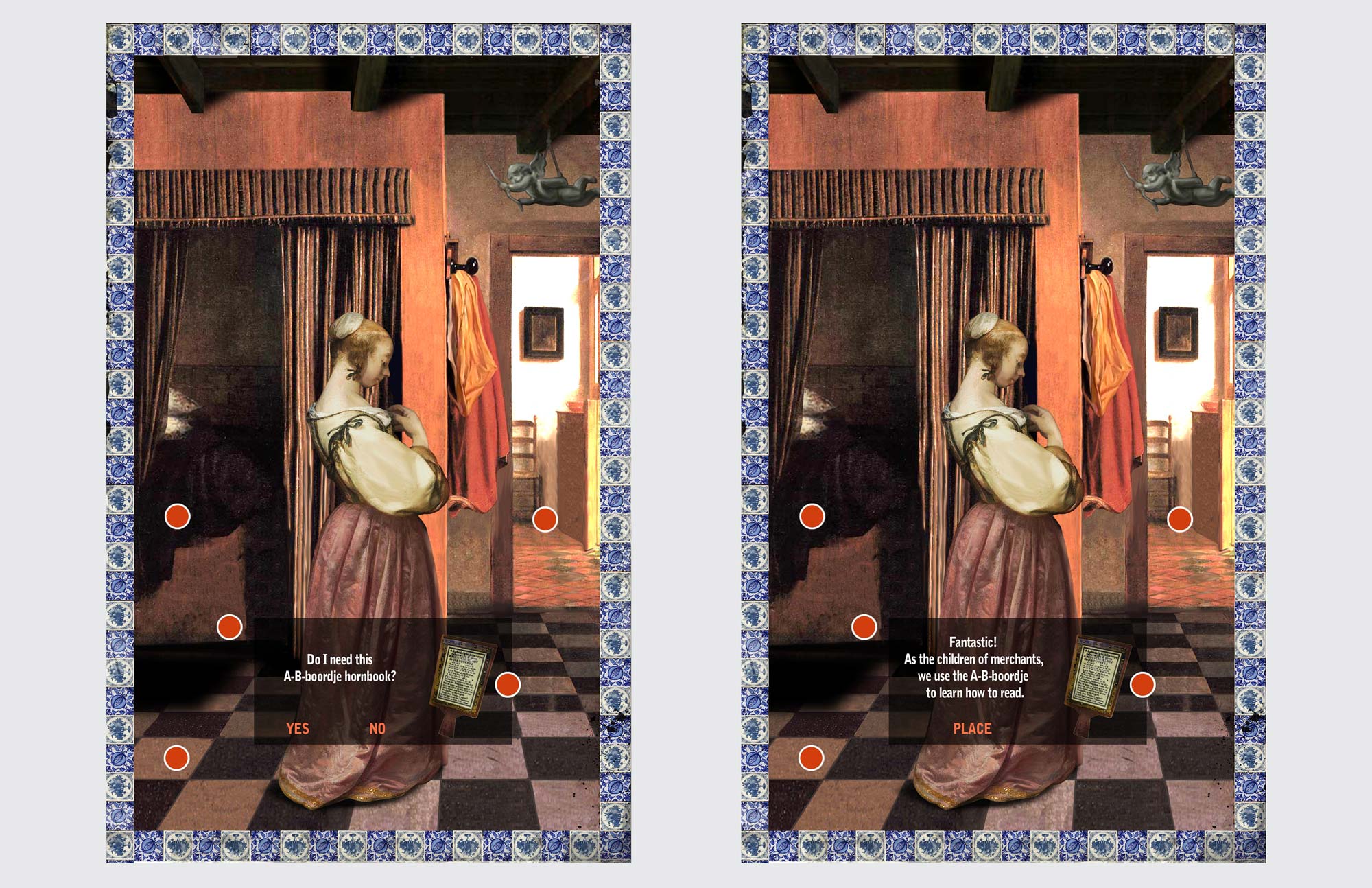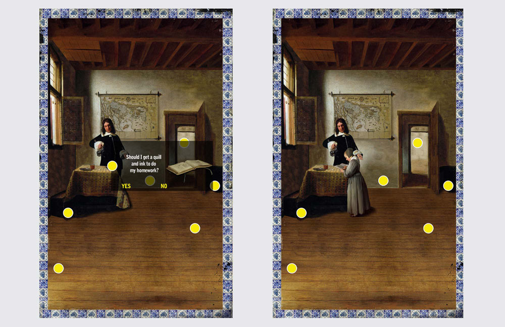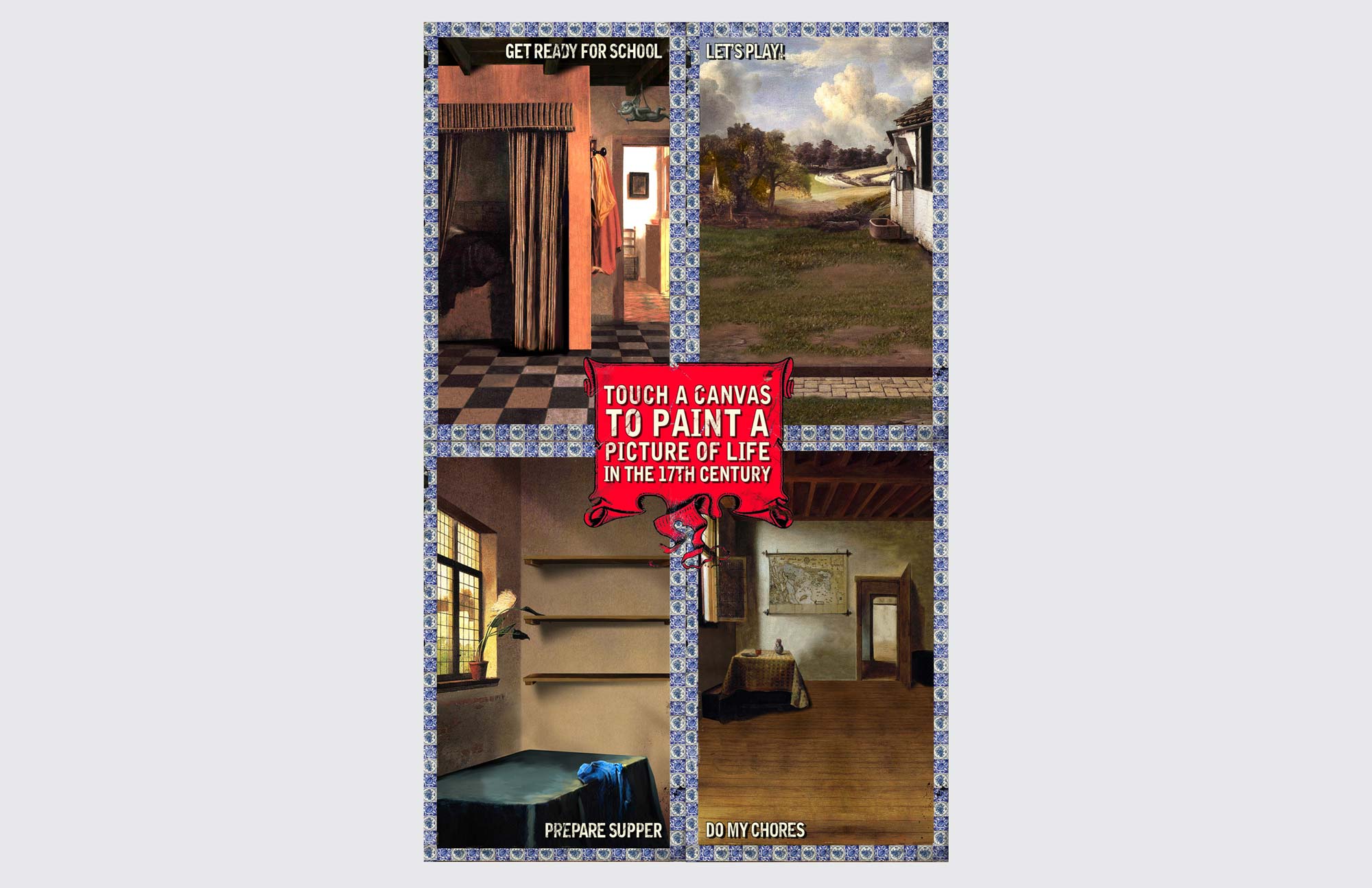 Presented in the style of Dutch Masters from that period, visitors are asked to 'paint' in the scenes by adding in relevant historic details. Visitors will learn what kids did at school, at meal times, their daily chores and their bed-time routines. As each item is added, information about it appears, highlighting different aspects of life. In each scene, when the item selected is correct, it will become part of the scene. As each right answer paints itself on, children get a clear picture of life in the 17th century. Enjoy a quick clip of the games and the screen grabs that follow.