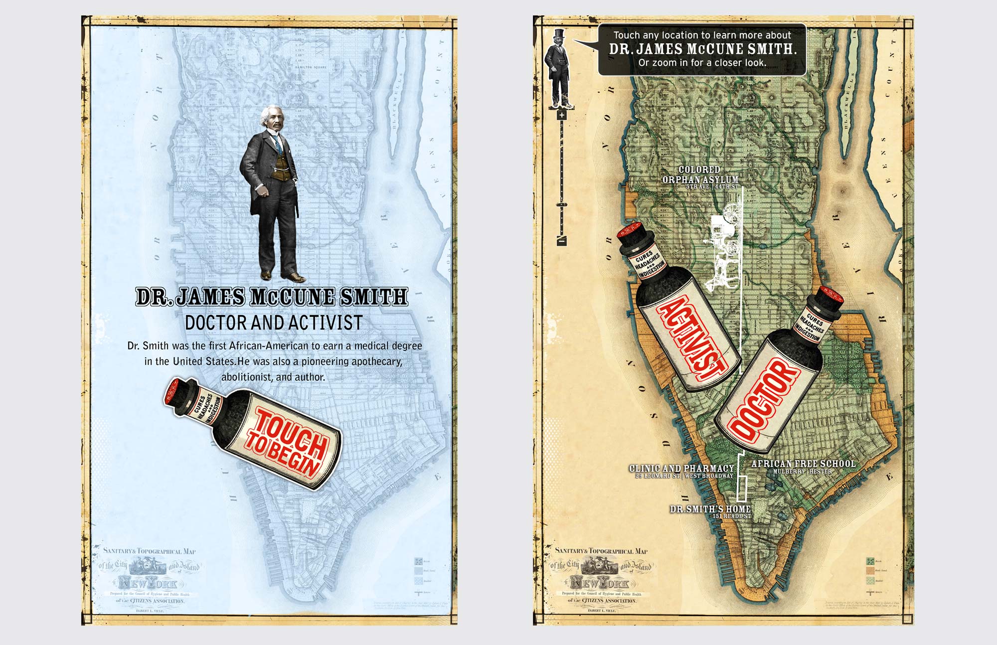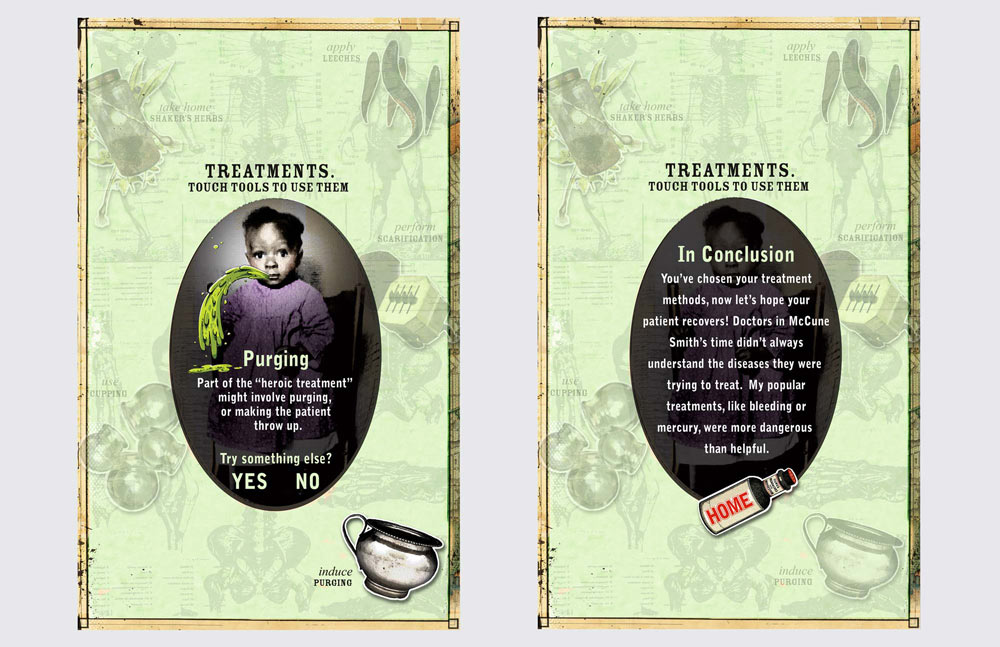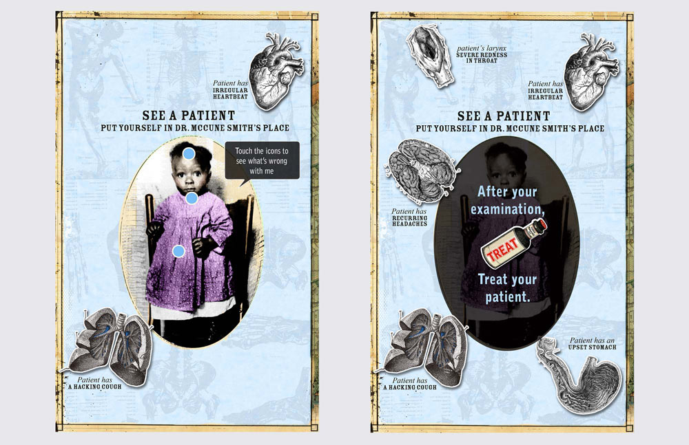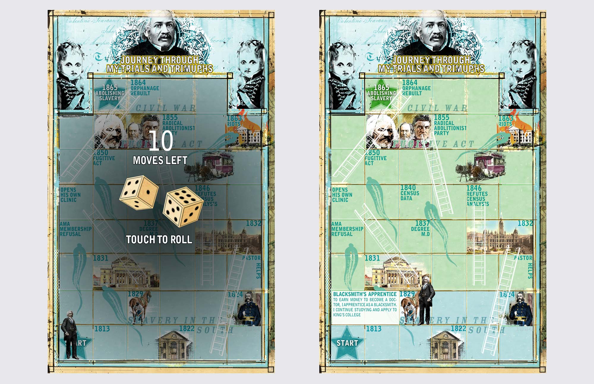 He was the first African-American doctor in New York City. Visitor learns about medical practices in the early to mid 1800's. They get to play Dr. James McCune Smith, as they diagnose and treat a patient. As the activist, visitors get to step in the doctor's shoes and face the same challenges he had to overcome to get where he was as an African American, through a game of "leeches and Ladders". Enjoy a quick clip of the games and the screen grabs that follow.