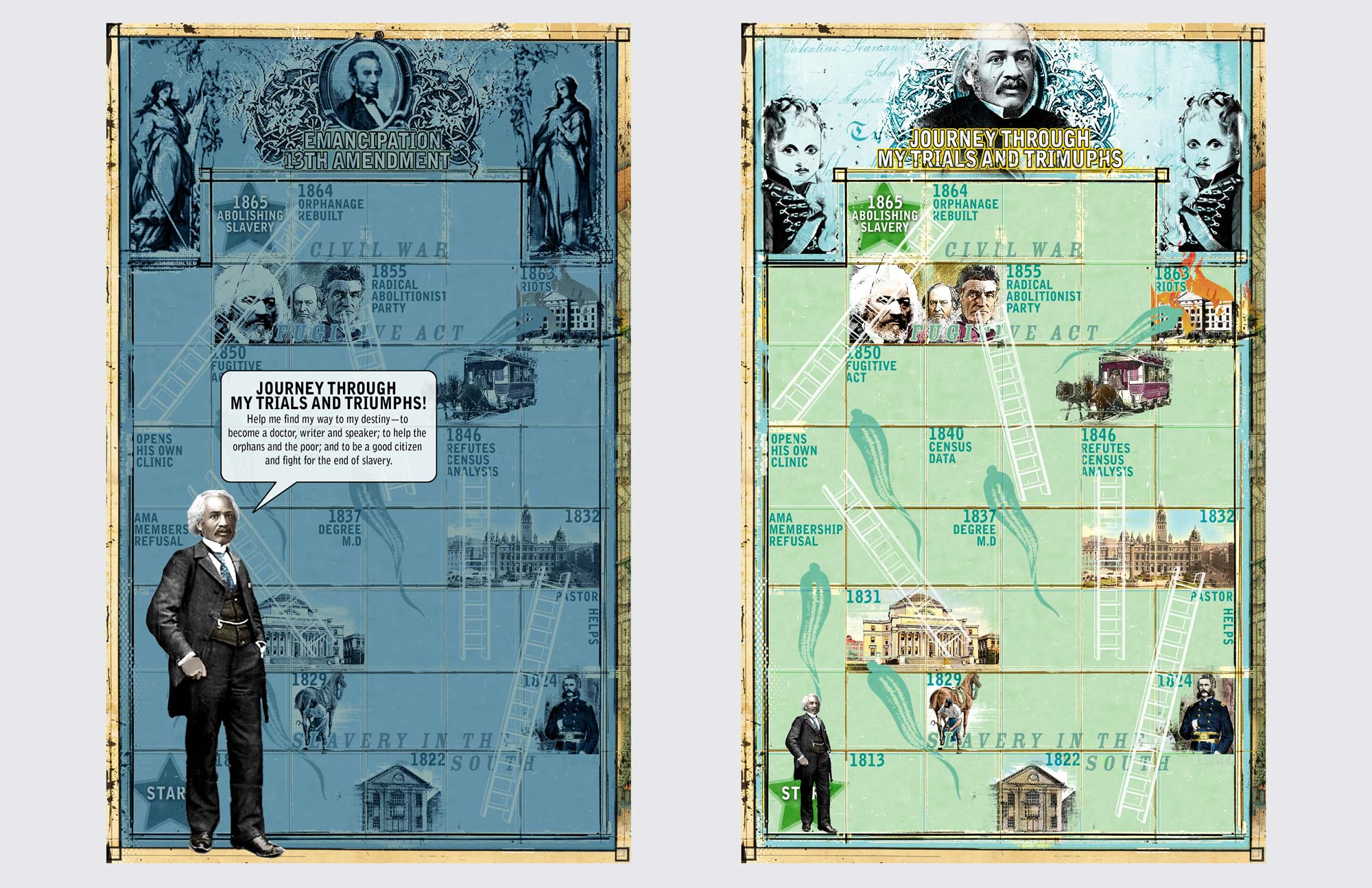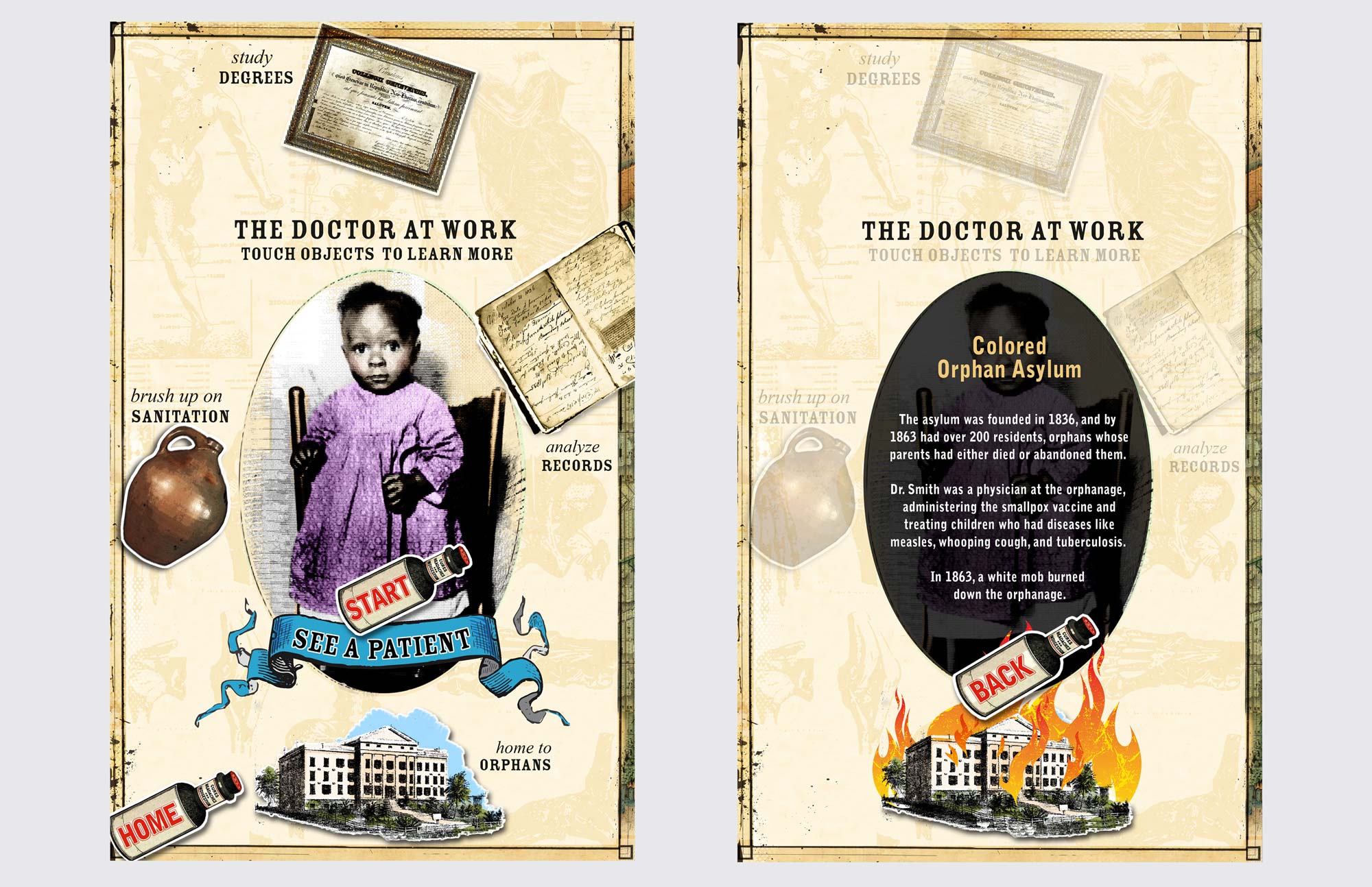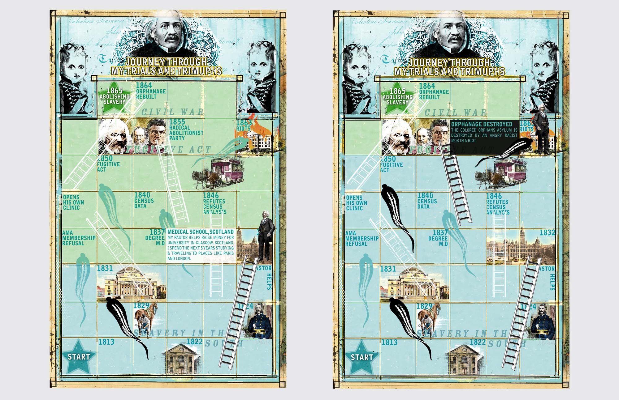 He was the first African-American doctor in New York City. Visitor learns about medical practices in the early to mid 1800's. They get to play Dr. James McCune Smith, as they diagnose and treat a patient. As the activist, visitors get to step in the doctor's shoes and face the same challenges he had to overcome to get where he was as an African American, through a game of "leeches and Ladders". Enjoy a quick clip of the games and the screen grabs that follow.