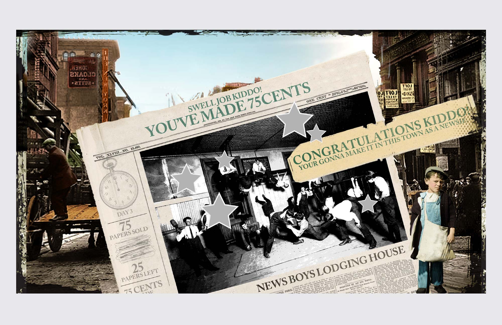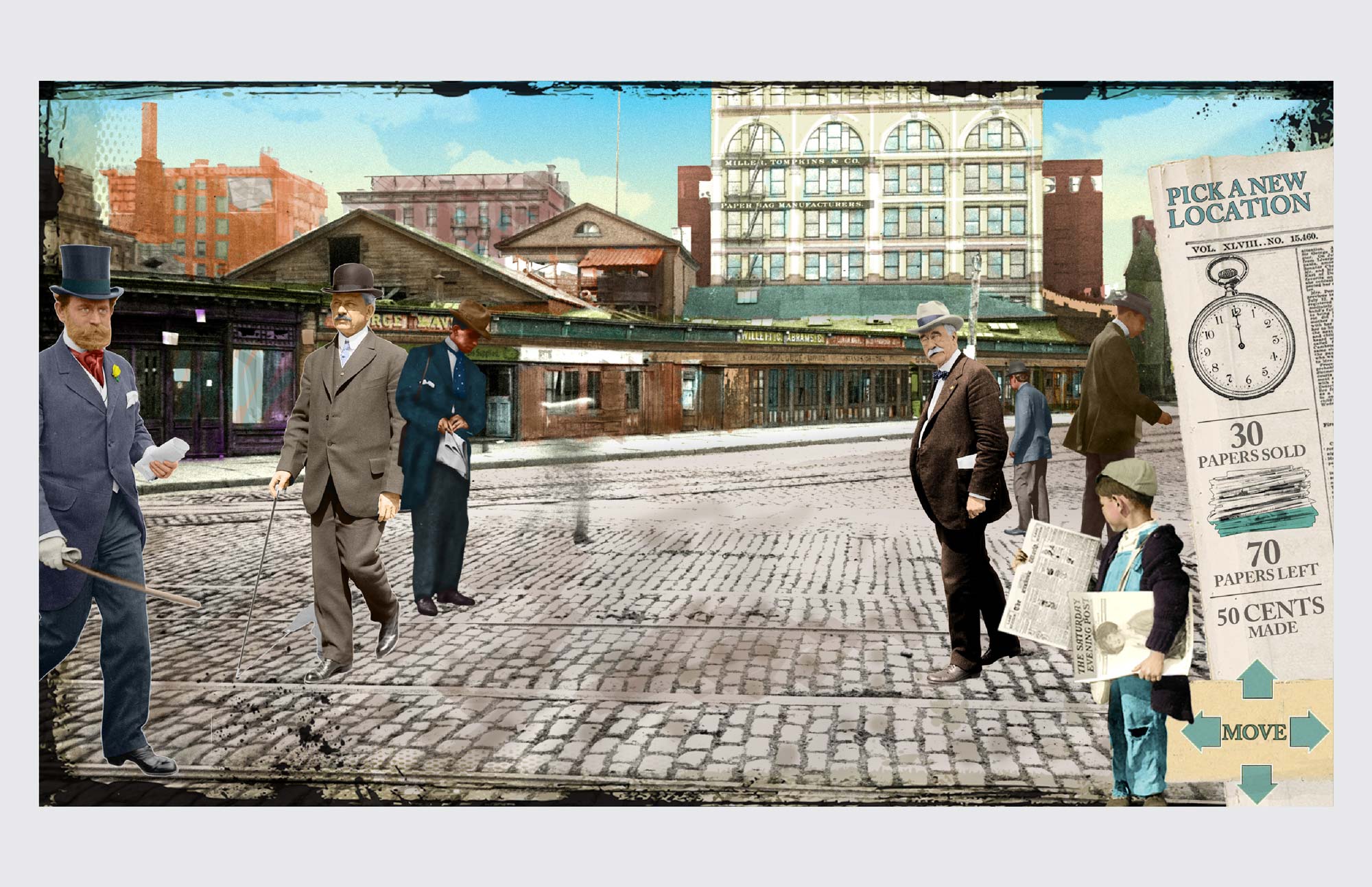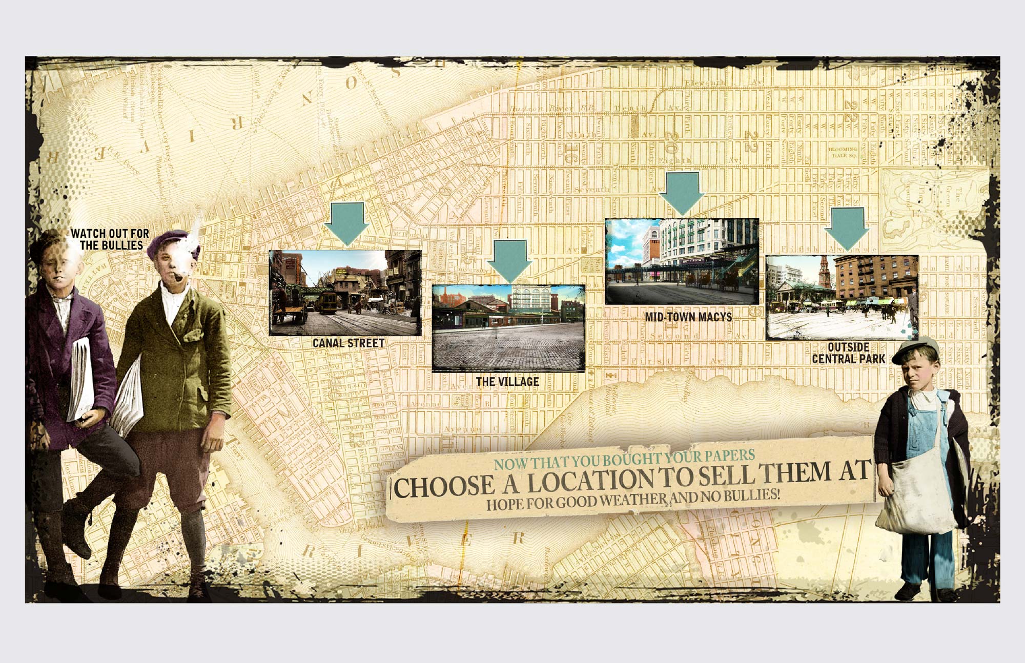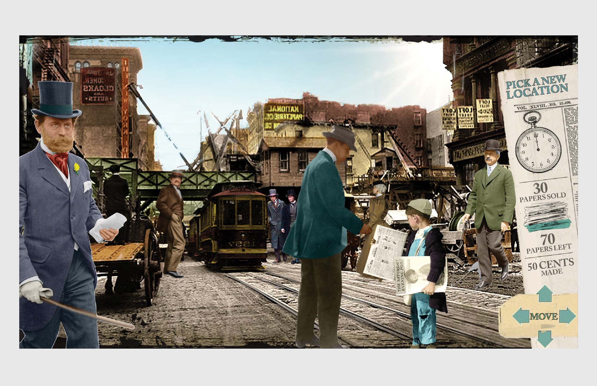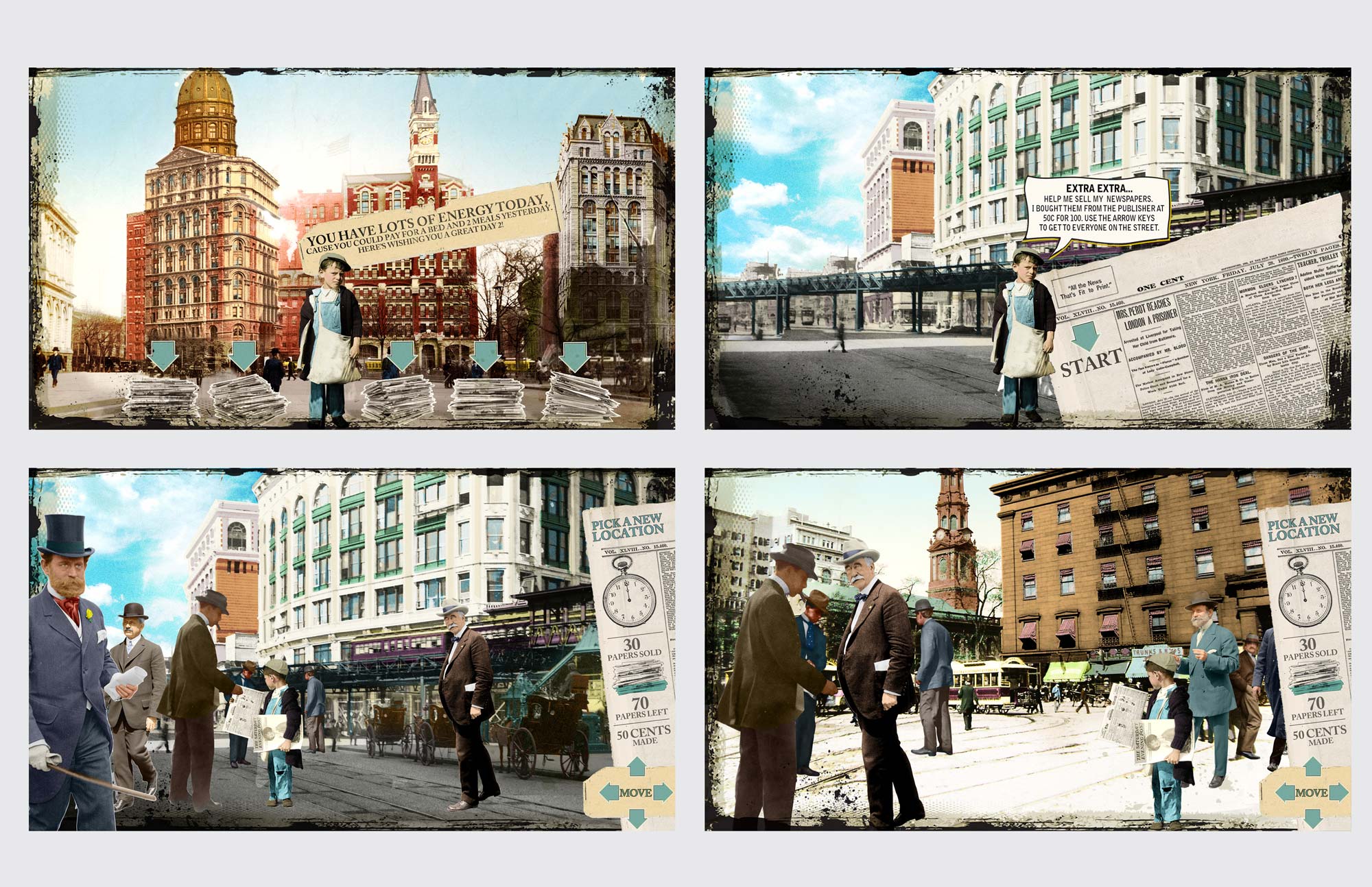 "Extra extra..." The story of newsies was hard. Inspired by classic photos of the late 1800s, early 1900s, this exhibit challenges the visitor to survive a three day period as a newsie. Visitors learn how choosing the right paper, locations and the climate impacted the the sale of papers. To survive, they must sell at least 50 papers per day and save enough to sleep and eat. If not, their performance the next day will be compromised. Enjoy a quick clip of the games and the screen grabs that follow.