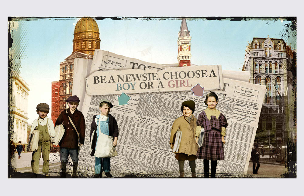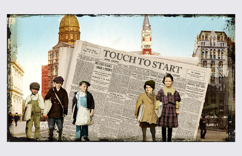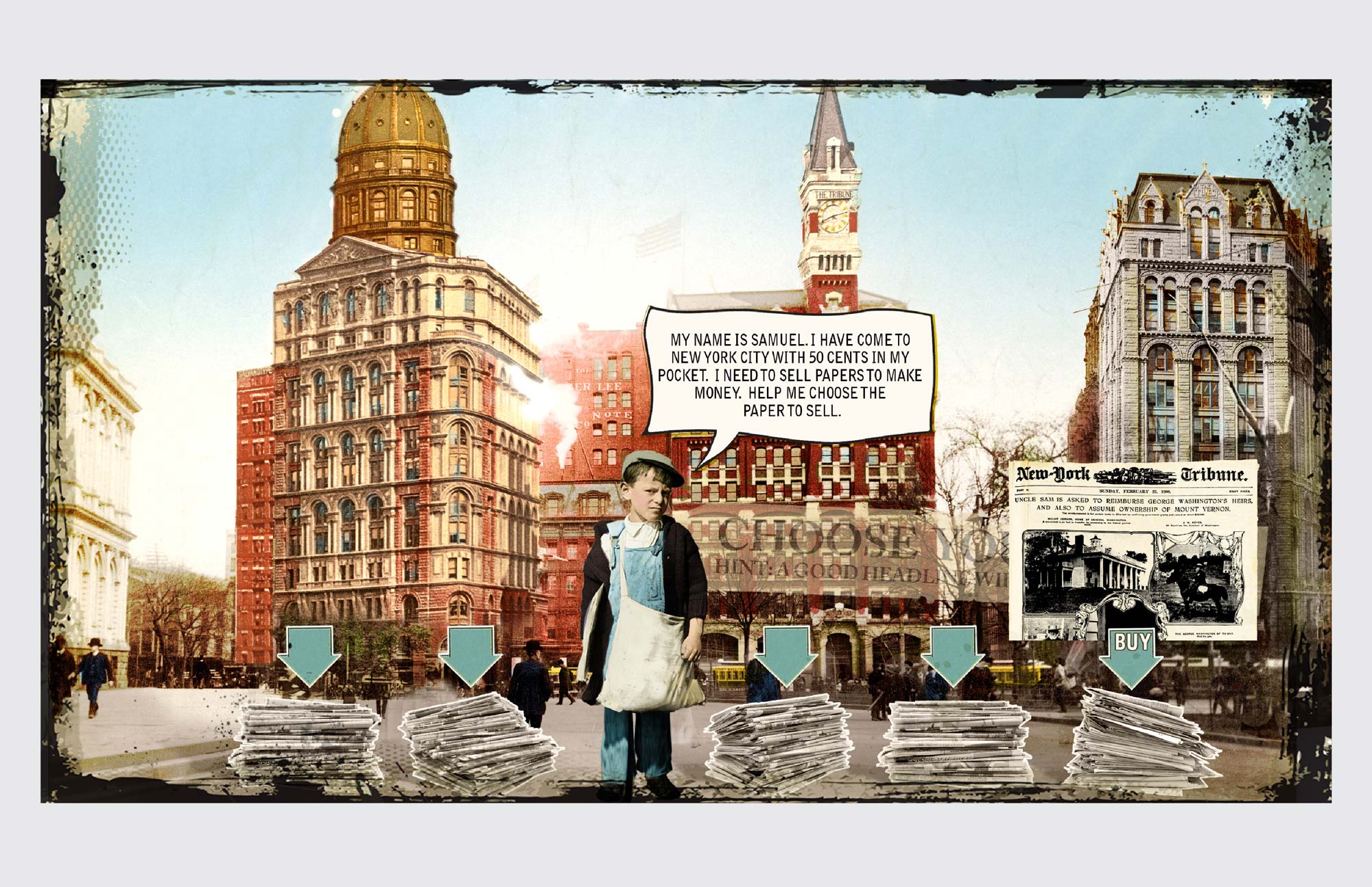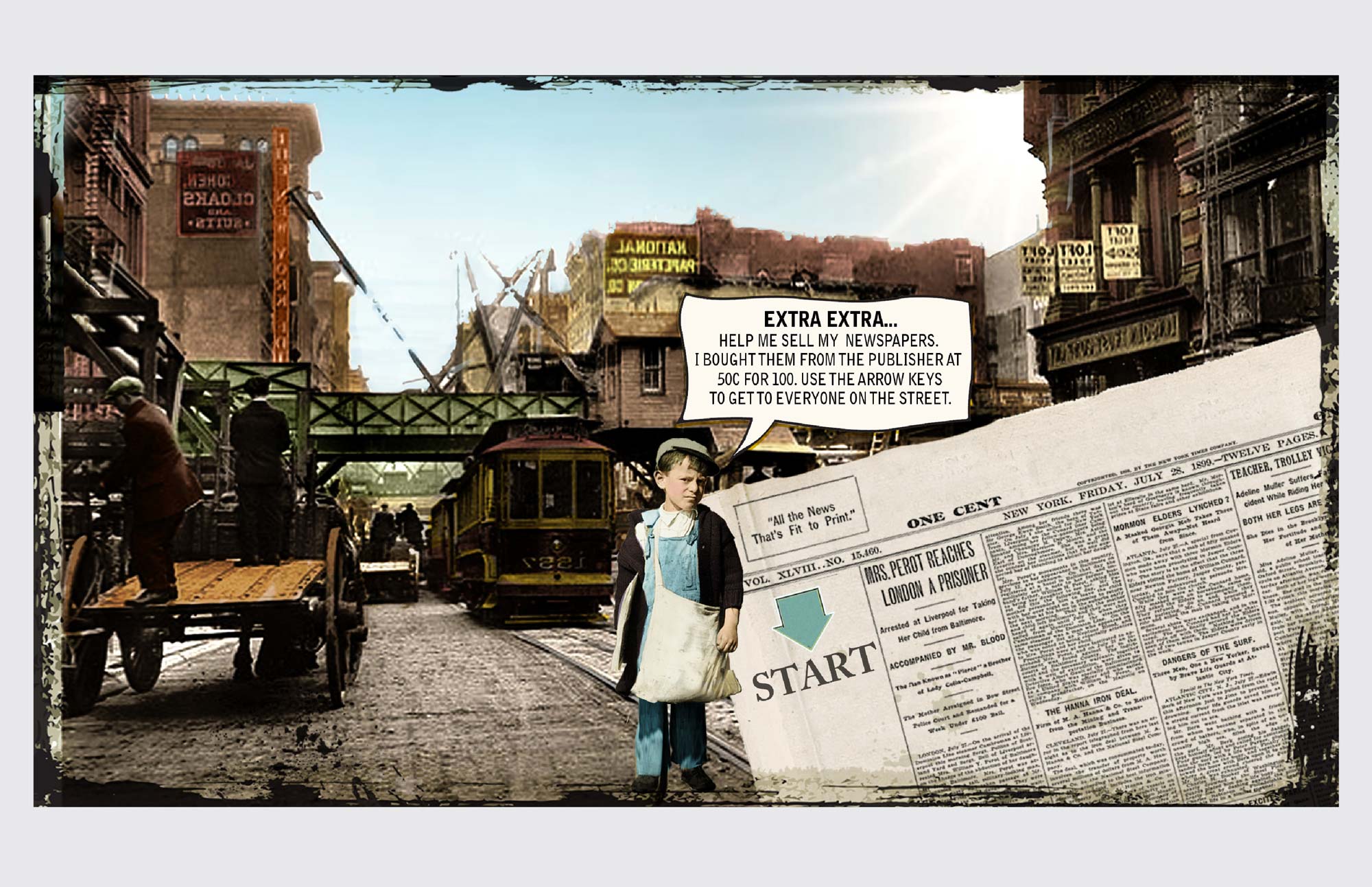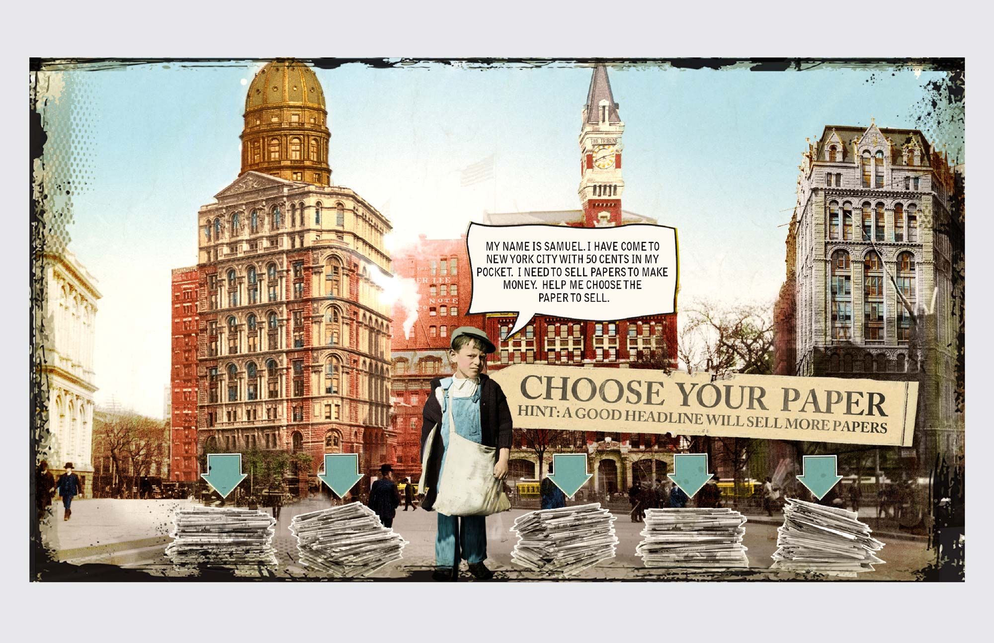 "Extra extra..." The story of newsies was hard. Inspired by classic photos of the late 1800s, early 1900s, this exhibit challenges the visitor to survive a three day period as a newsie. Visitors learn how choosing the right paper, locations and the climate impacted the the sale of papers. To survive, they must sell at least 50 papers per day and save enough to sleep and eat. If not, their performance the next day will be compromised. Enjoy a quick clip of the games and the screen grabs that follow.