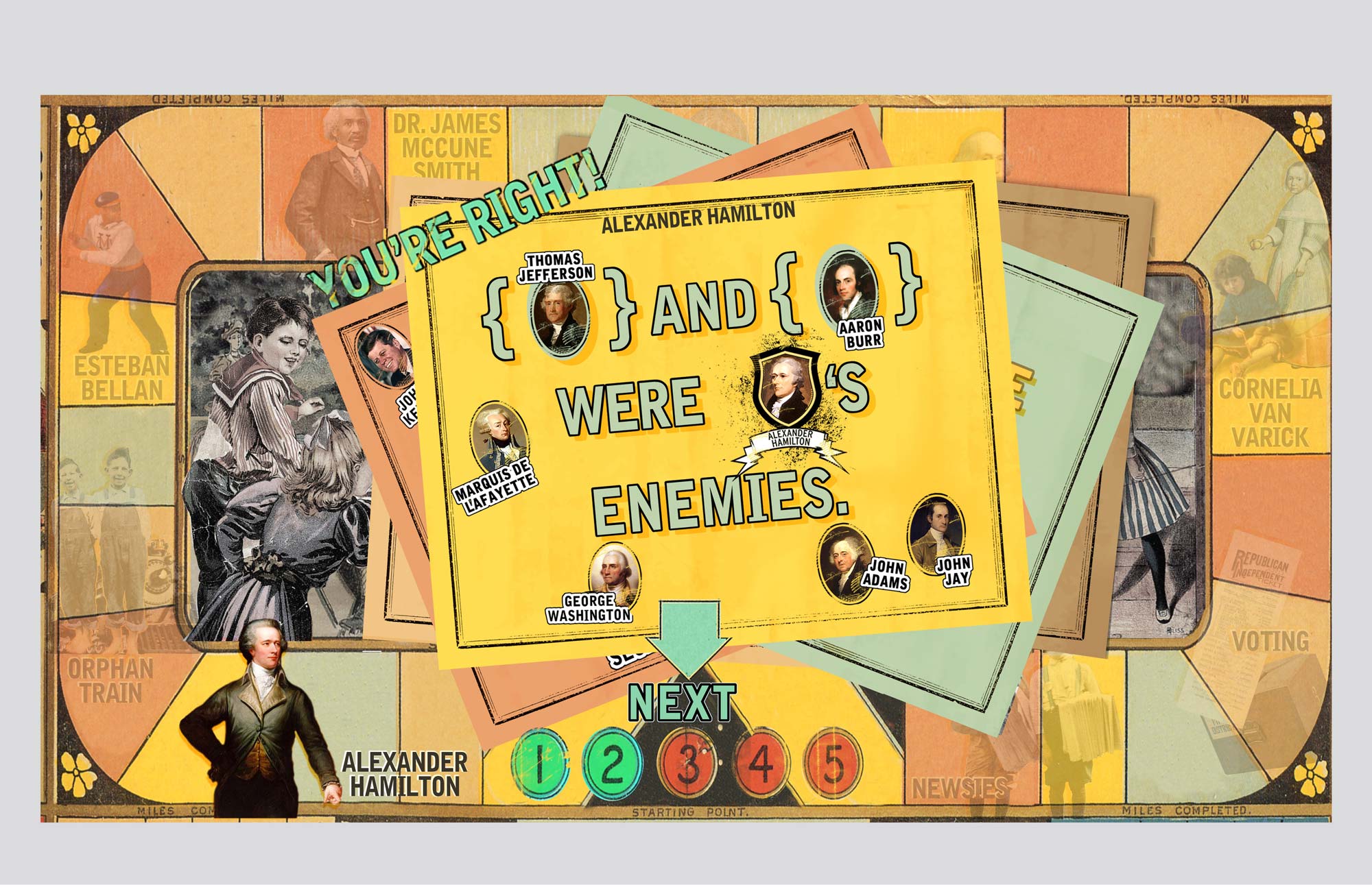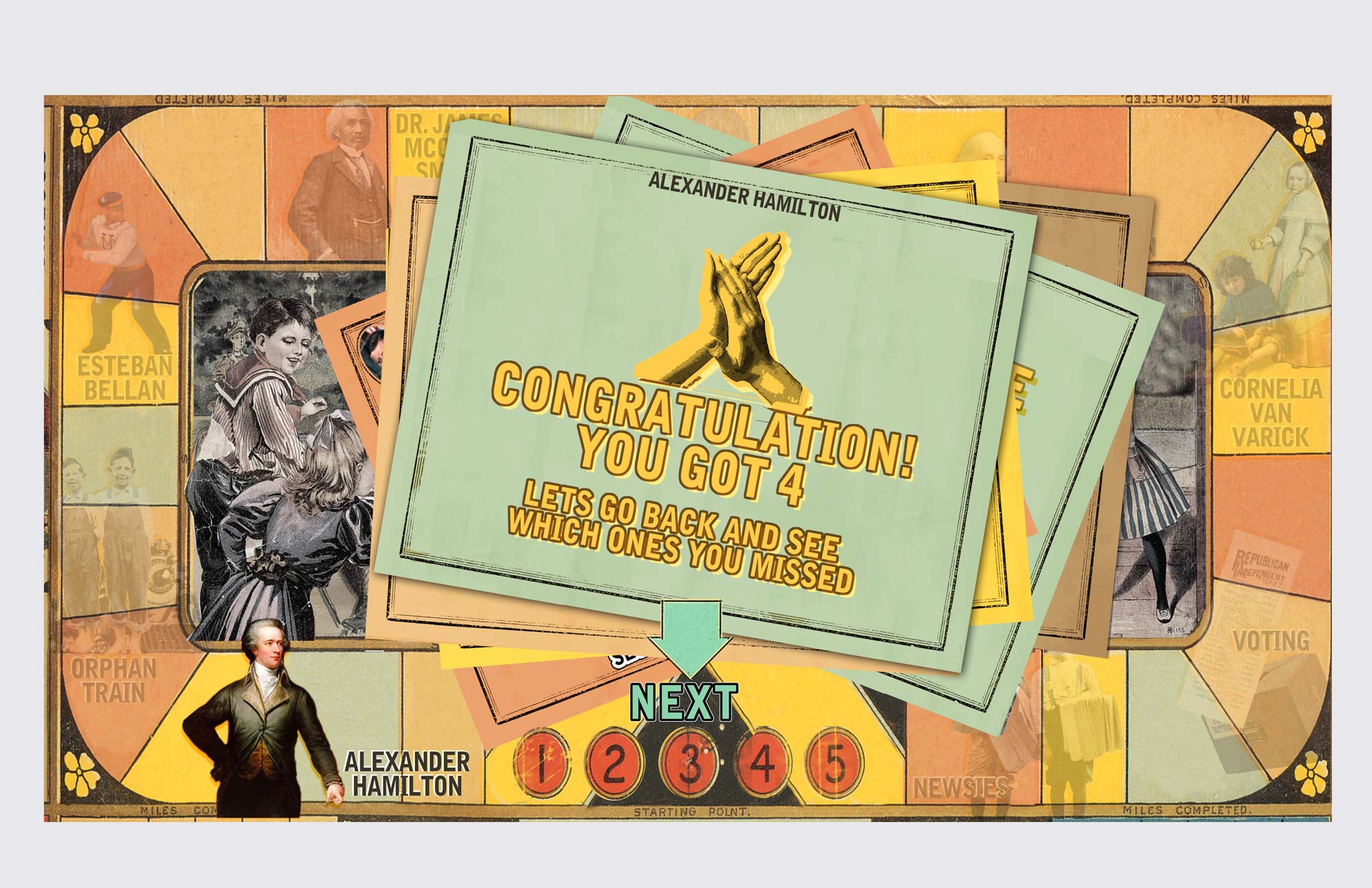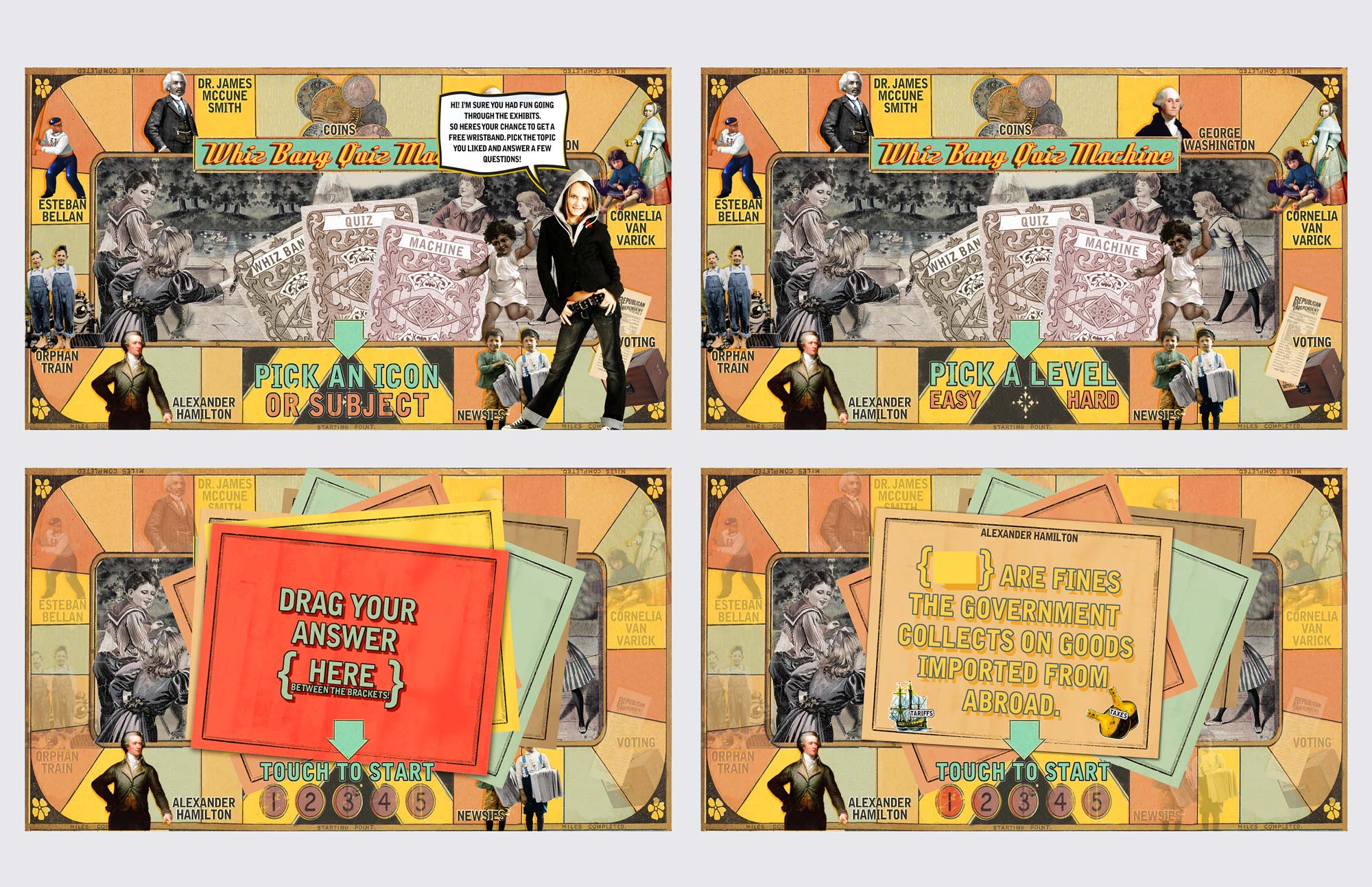 Inspired by old board games, this exhibit is designed to quiz visitors on all the exhibits in the museum. Giving them options to pick easy or hard, the game challenges multiple age groups with fun fill-in-the blank cards using images from all the exhibits and games they have already played. This multiple-choice game makes answering questions fun and educational. Enjoy a quick clip of the games and the screen grabs that follow.