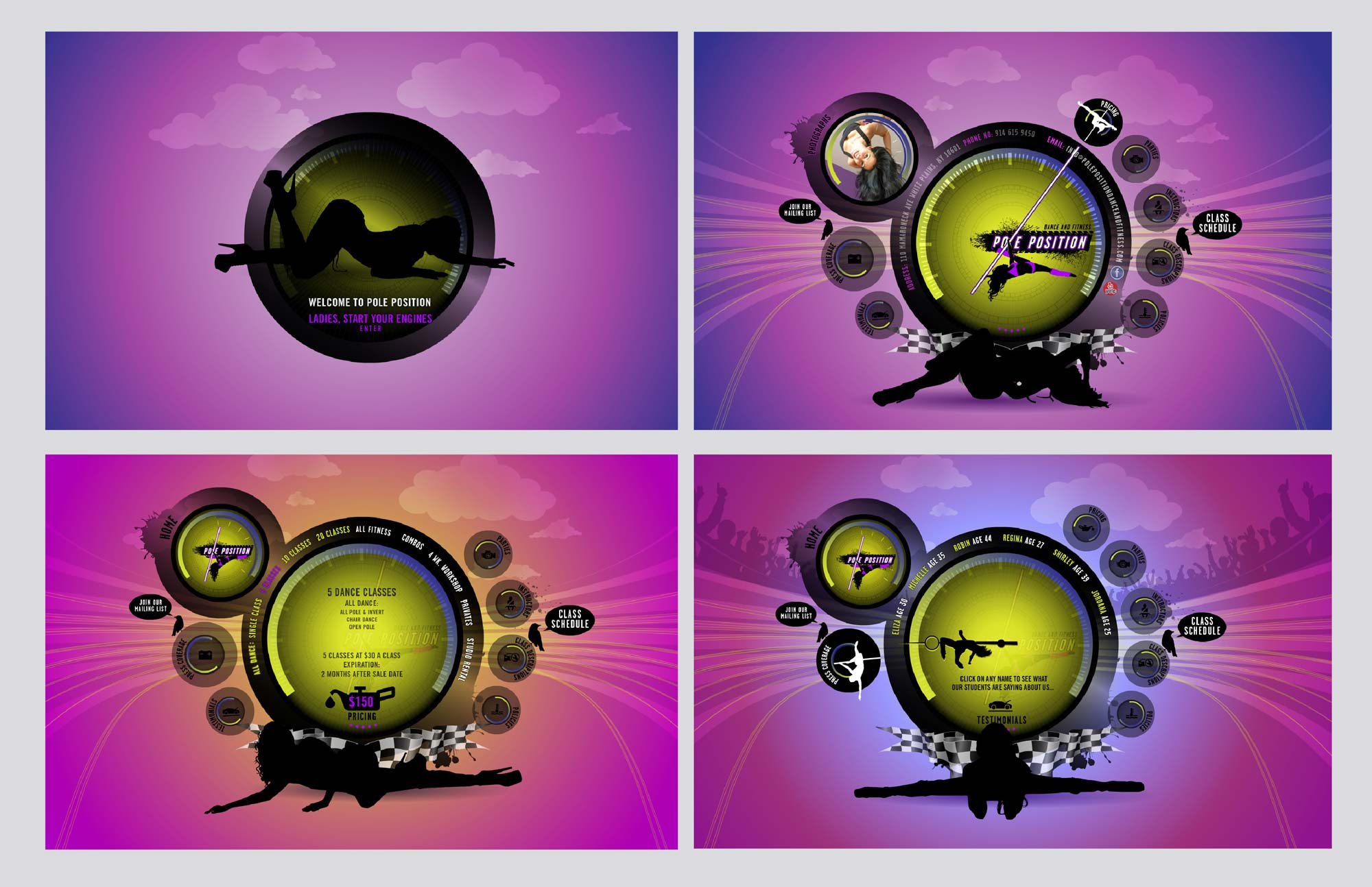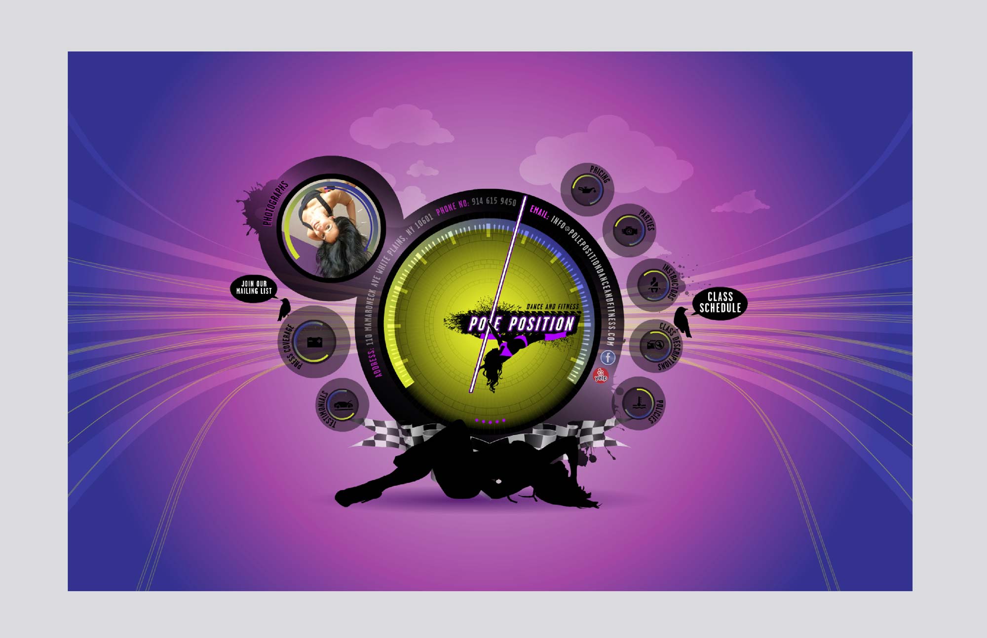Take the pole fitness society and add a little car racing to it, and you get... pole position. This site is sensual and strong, just like the sport of pole dancing. It has undertones of racing to add that extra oomph (not that its needed). The look of the site is inspired by the dash board of a racing car. The site transports you to another dimension of yourself, unafraid, strong and sexy. a place to play with your sexuality in a safe environment.