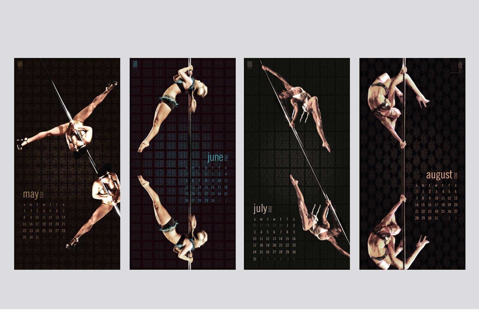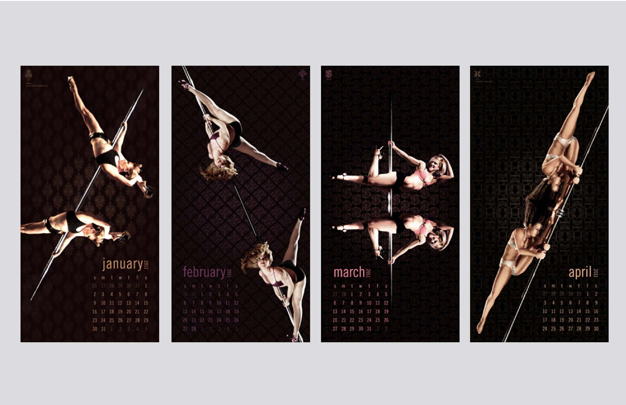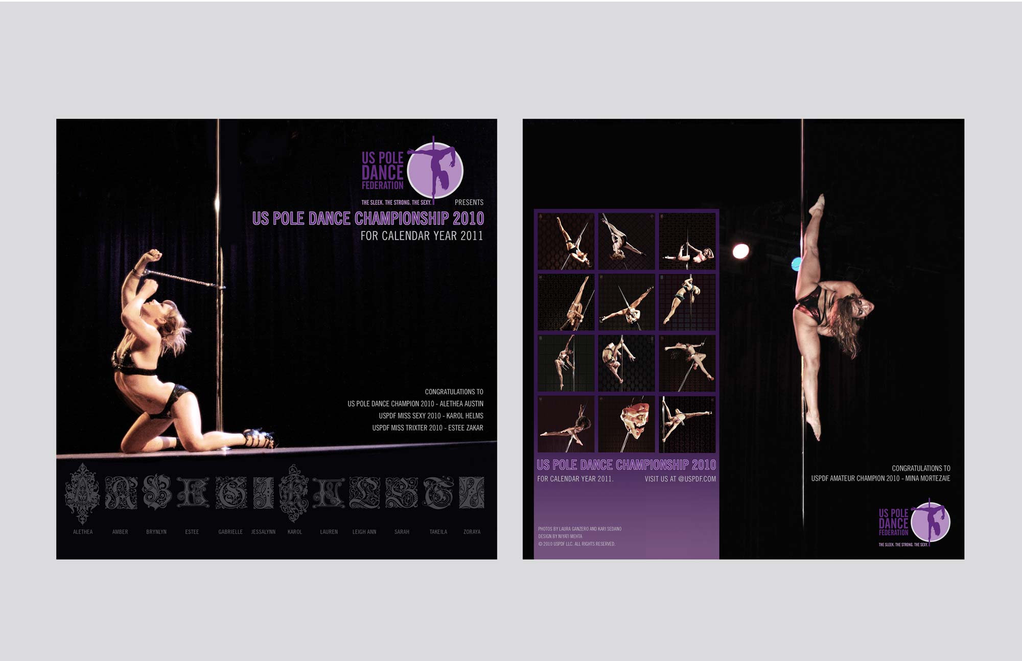 Create an identity that reflects the strength, flexibility and individuality pole dance requires as a sport and discipline. Rectify any pre-concieved notions associated with the sport, with simple, clean and direct execution. Color choice is feminine and strong. Also attached is the calendar design based on the second annual uspdf national competition, with candid shots of contestants placed as reflections to flaunt the duality of the sport. Raw photos for calendar by laura ganzero.